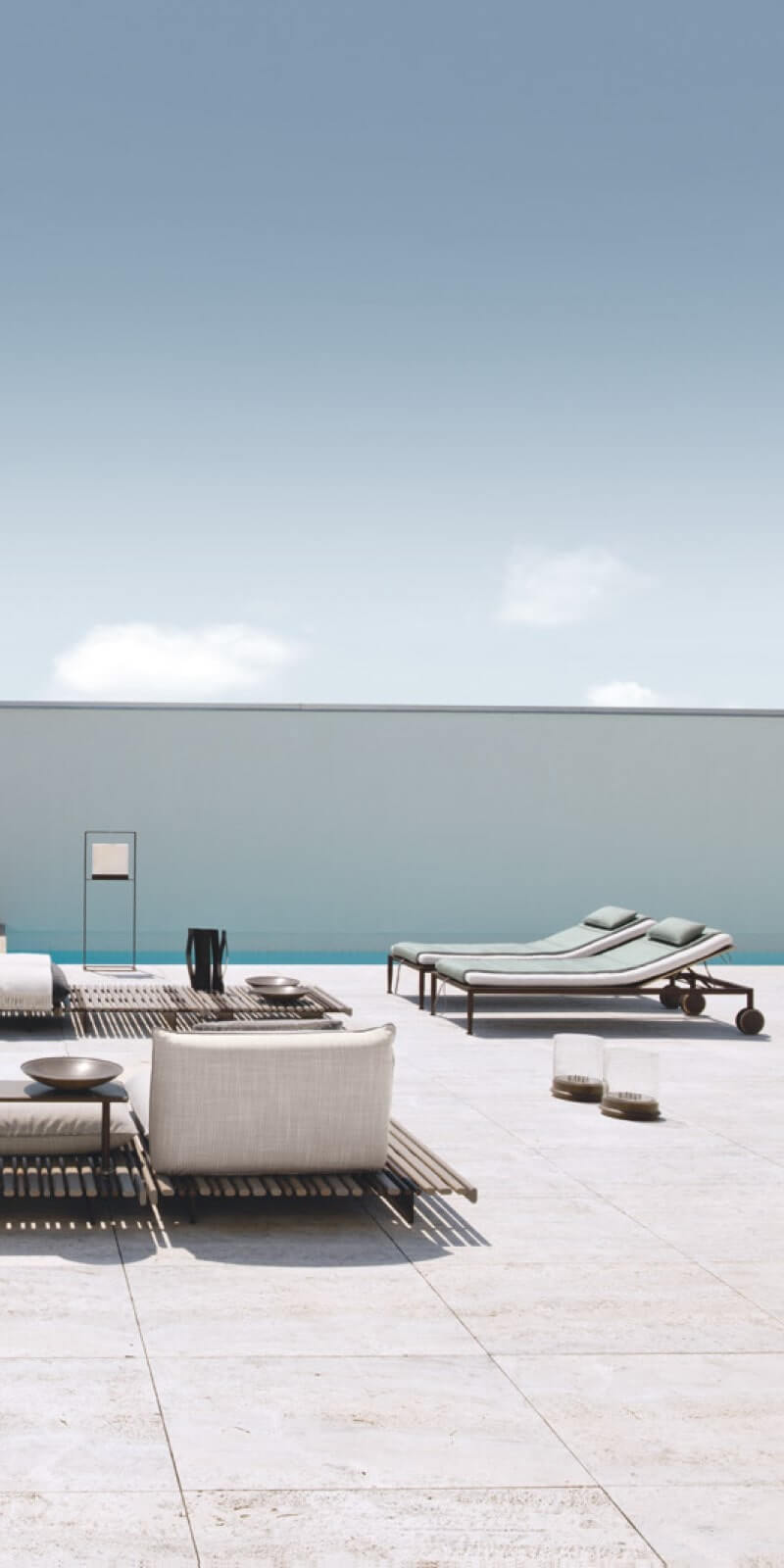 The typical elegance of interiors, made up of research into details, design of shapes, precious materials, conquers the outdoors. Real open-air rooms for an experience of style and maximum comfort: sofas, sun loungers, armchairs and chairs, tables, coffee tables, sunshades and many other accessories for outdoors, gardens, pool sides and terraces.