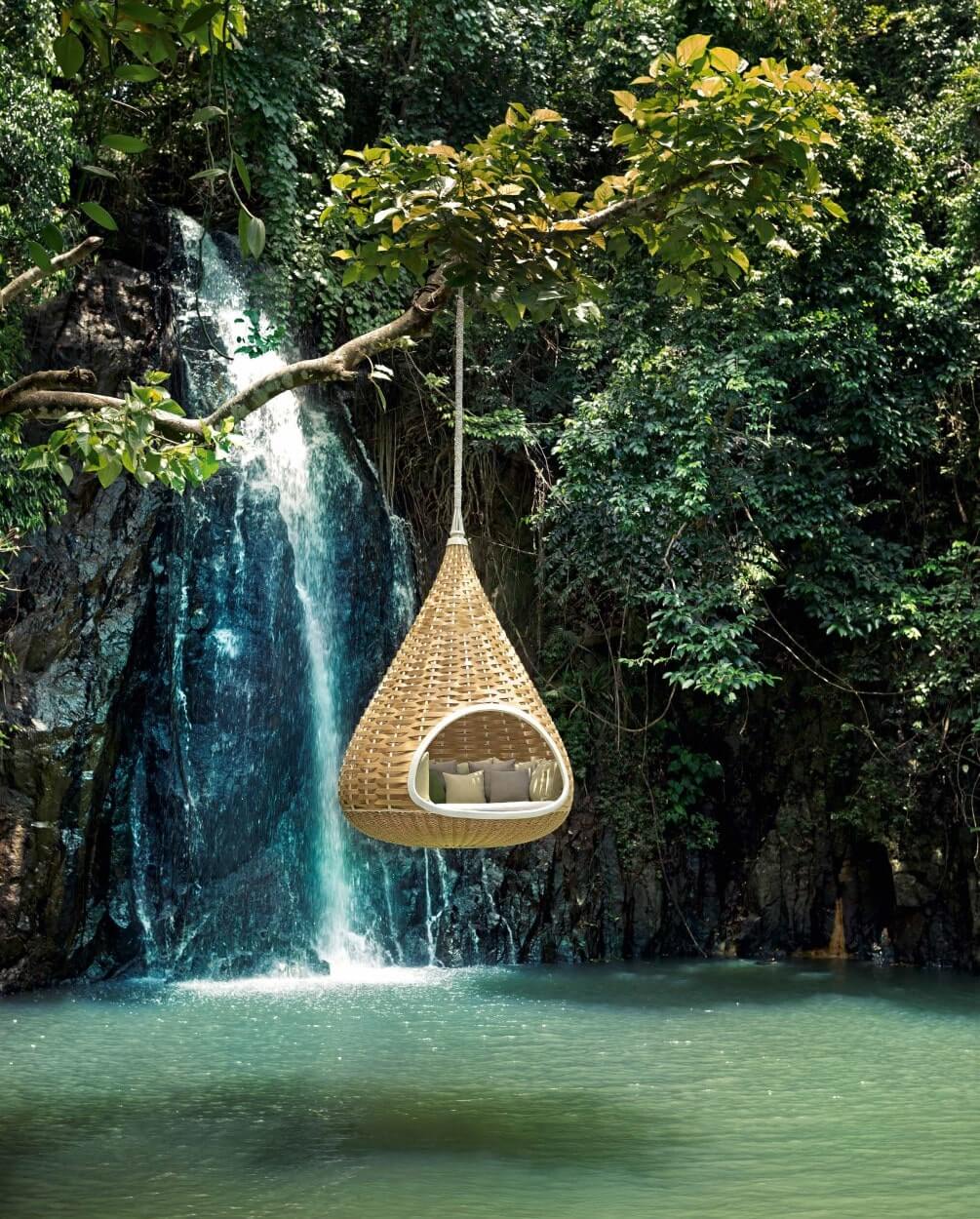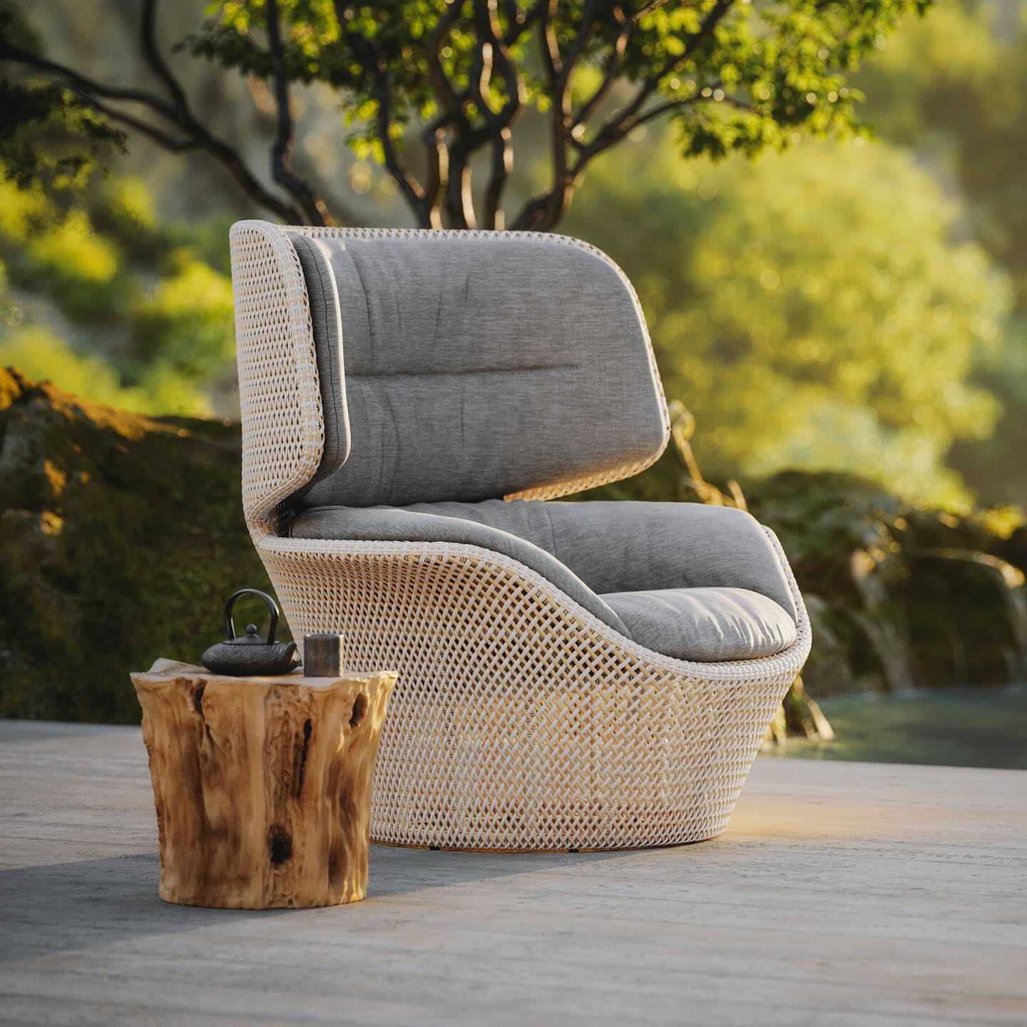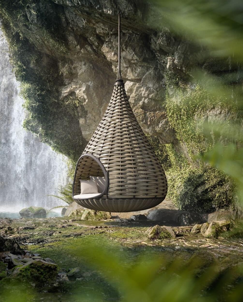 Stephen Burks’ award-winning collection is as delightful to look at as to use. The hanging longue chair is the first collection to be wrapped rather than woven in 834 meters of Dedon Fiber Touch, and features a cradle-like organic form that's open, airy, light and inviting. Once inside, users can luxuriate in KIDA's comfy cushion, which covers the entire seating area, and feel, in Burks' own words, “as free as the breeze” when swinging.