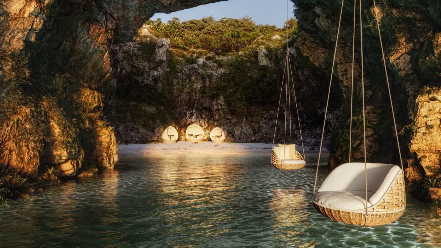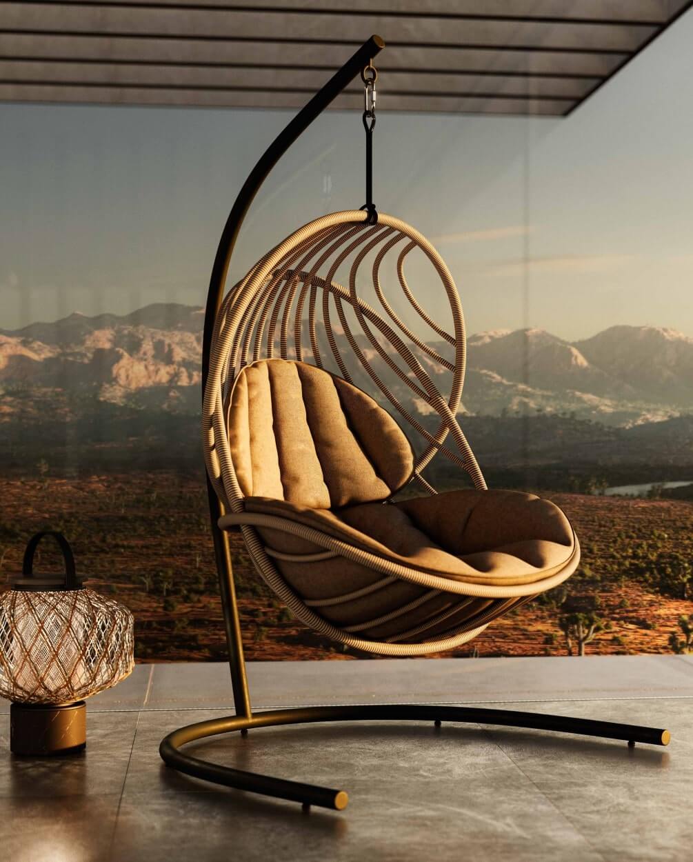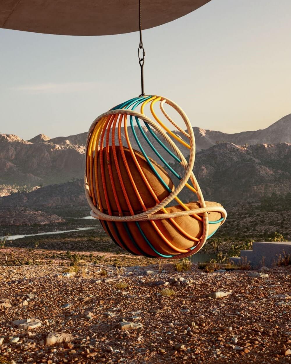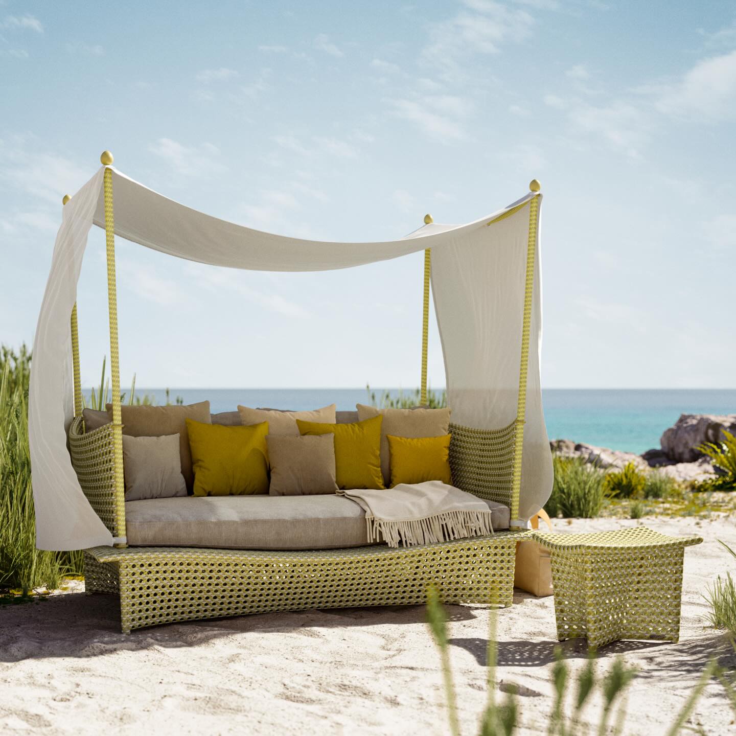 Stephen Burks’ award-winning collection is as delightful to look at as to use. The hanging longue chair is the first collection to be wrapped rather than woven in 834 meters of Dedon Fiber Touch, and features a cradle-like organic form that's open, airy, light and inviting. Once inside, users can luxuriate in KIDA's comfy cushion, which covers the entire seating area, and feel, in Burks' own words, “as free as the breeze” when swinging.