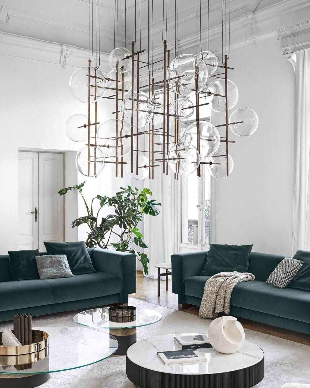 The glamorous lighting crafted from clear glass. These spheres beautifully reflect the hand-finished burnished brass frame.
