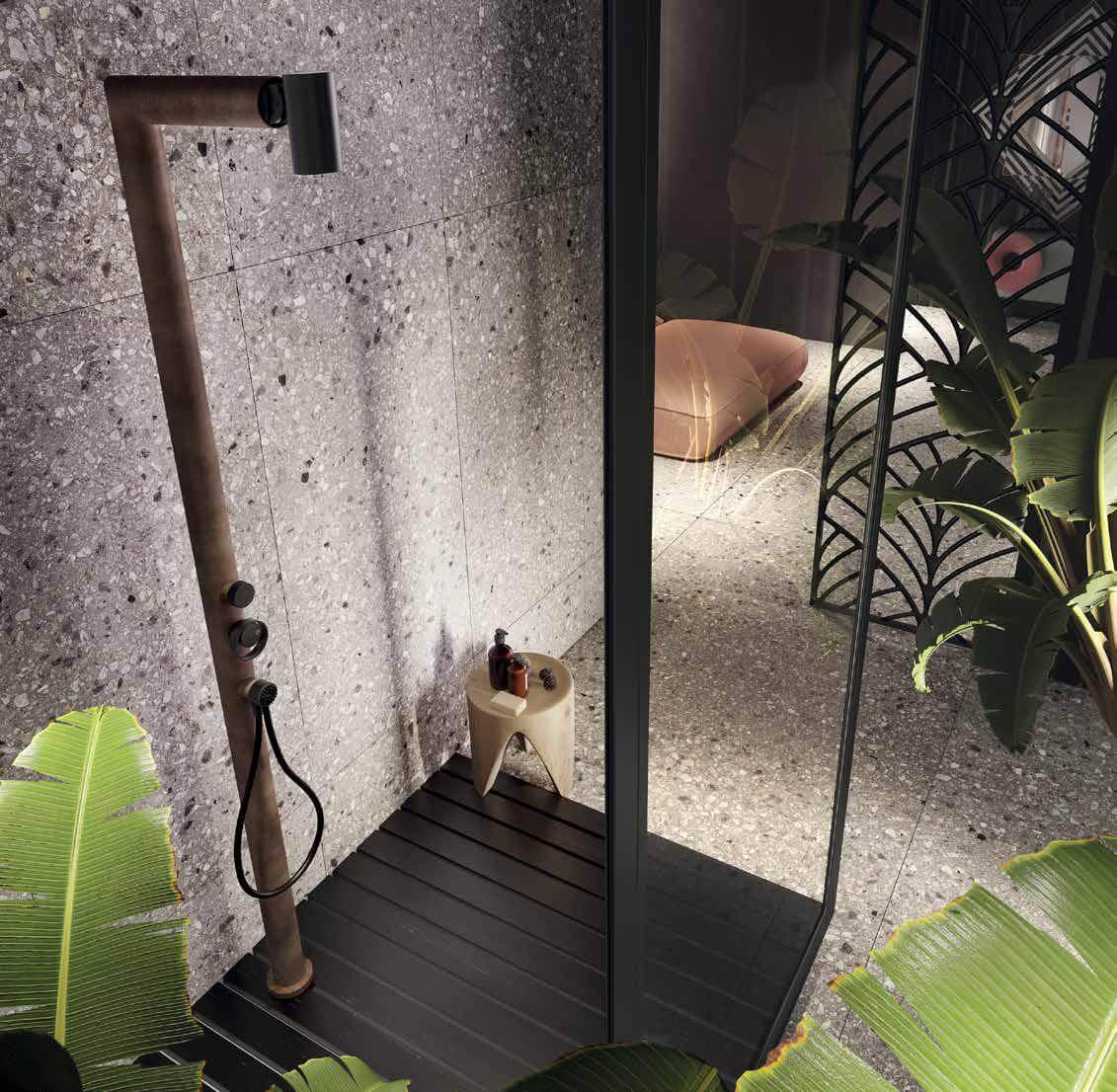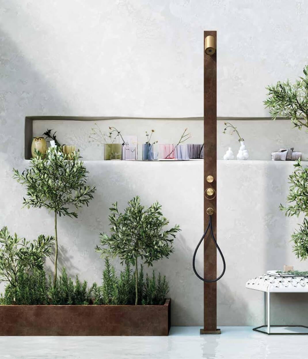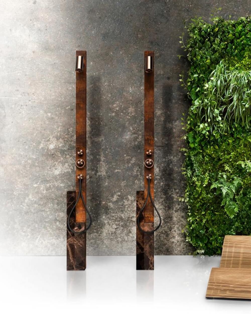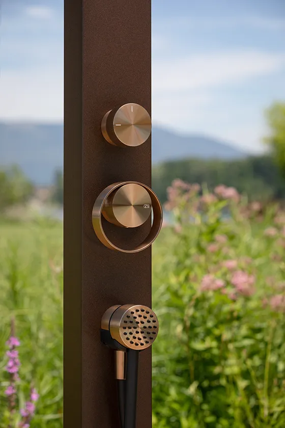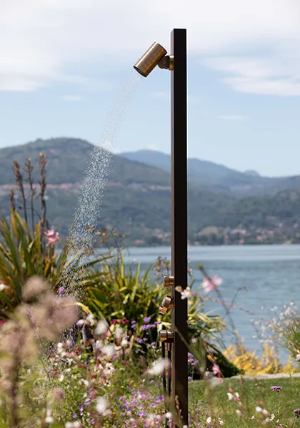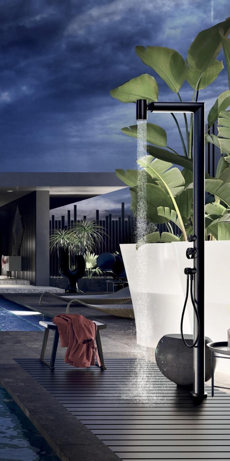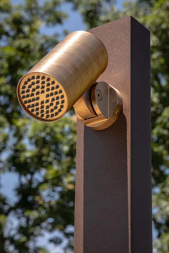 The self-supporting shower columns of the Gessi Outdoor Wellness System have been specially designed – in terms of shape and components – to be used both indoors and outdoors: a terrace, a poolside, a garden. They offer absolutely innovative combinations of materials, finishes and processes, with the aim of recreating the style and functionality typical of the Gessi Private Wellness System even outside, in a private and domestic sanctuary of wellness or in resort environments.