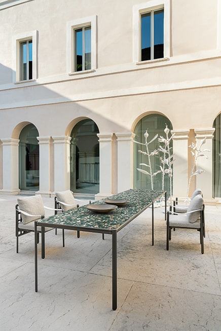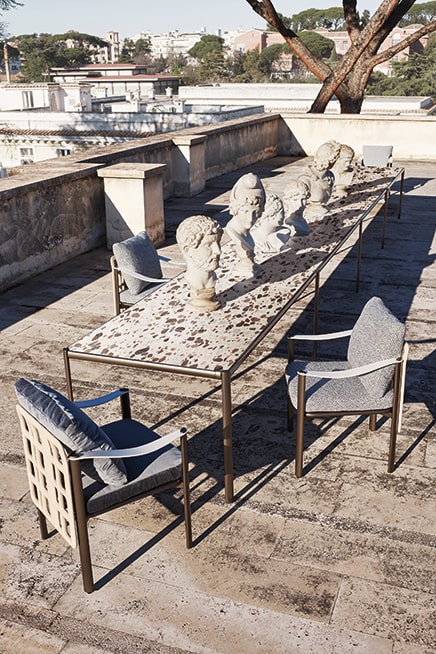 An outdoor dining set where precious materials and indoor elegance take over the open air.
