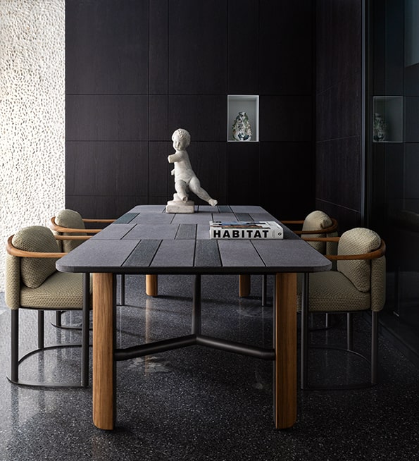 With changing habits, life in the fresh air has become the true protagonist of contemporary life. The boundary between indoor and outdoor is increasingly thinner and the typical elegance of indoor environments, made of research on details, design of shapes, preciousness of materials, conquers the outdoor. Giorgetti is a great interpreter of this revolution in living. Season after season, the company has been able to translate the needs of the open-air spaces in an increasingly articulated way, transforming gardens and terraces, hotels, restaurants and yachts into true open sky rooms for an experience of style and maximum comfort. It is in this context of continuous research that the new Aldìa collection designed by Carlo Colombo was born: a complete system of furniture that can be used both indoors and outdoors. Armchairs, modular sofas, poufs and coffee tables are designed to define the space with elegance and make the dream of a small paradise come true. The stratified wood, pantographed and then worked by hand seems to have been shaped by the wind, the textile fabrics spread the warm shades of Caribbean sunsets, the surfaces of the tables designed by fragments of marble and stones recall ancestral nature.