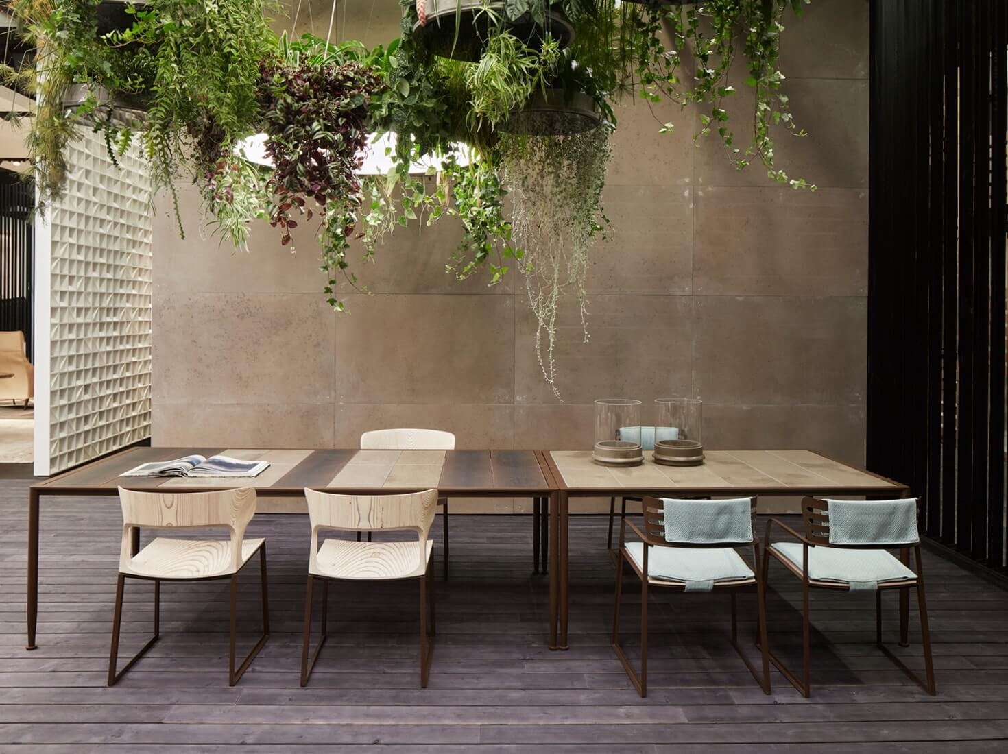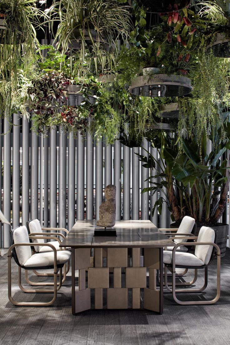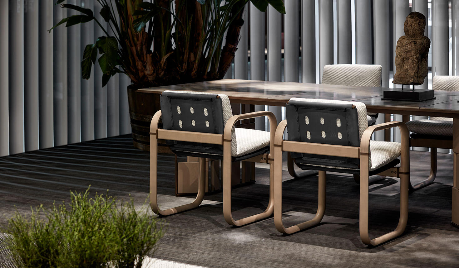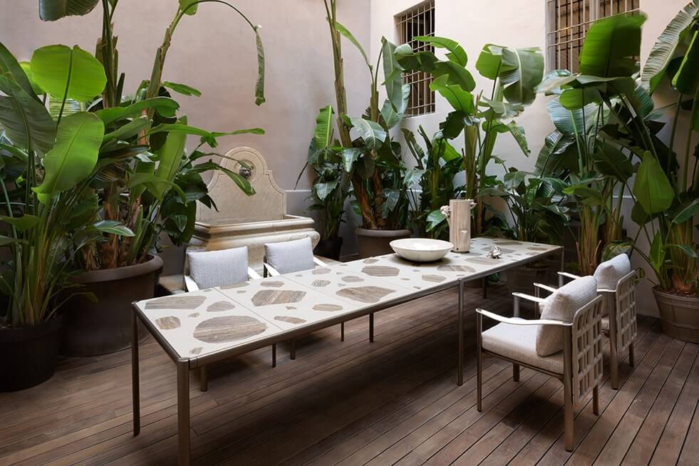 An outdoor dining set where precious materials and indoor elegance take over the open air.