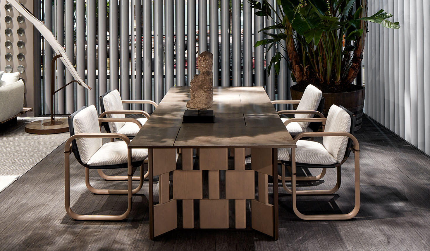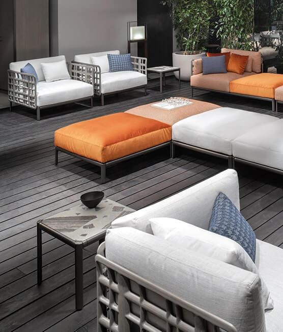 With changing habits, life in the fresh air has become the true protagonist of contemporary life. The boundary between indoor and outdoor is increasingly thinner and the typical elegance of indoor environments, made of research on details, design of shapes, preciousness of materials, conquers the outdoor. Giorgetti is a great interpreter of this revolution in living. Season after season, the company has been able to translate the needs of the open-air spaces in an increasingly articulated way, transforming gardens and terraces, hotels, restaurants and yachts into true open sky rooms for an experience of style and maximum comfort. It is in this context of continuous research that the new Aldìa collection designed by Carlo Colombo was born: a complete system of furniture that can be used both indoors and outdoors. Armchairs, modular sofas, poufs and coffee tables are designed to define the space with elegance and make the dream of a small paradise come true. The stratified wood, pantographed and then worked by hand seems to have been shaped by the wind, the textile fabrics spread the warm shades of Caribbean sunsets, the surfaces of the tables designed by fragments of marble and stones recall ancestral nature.