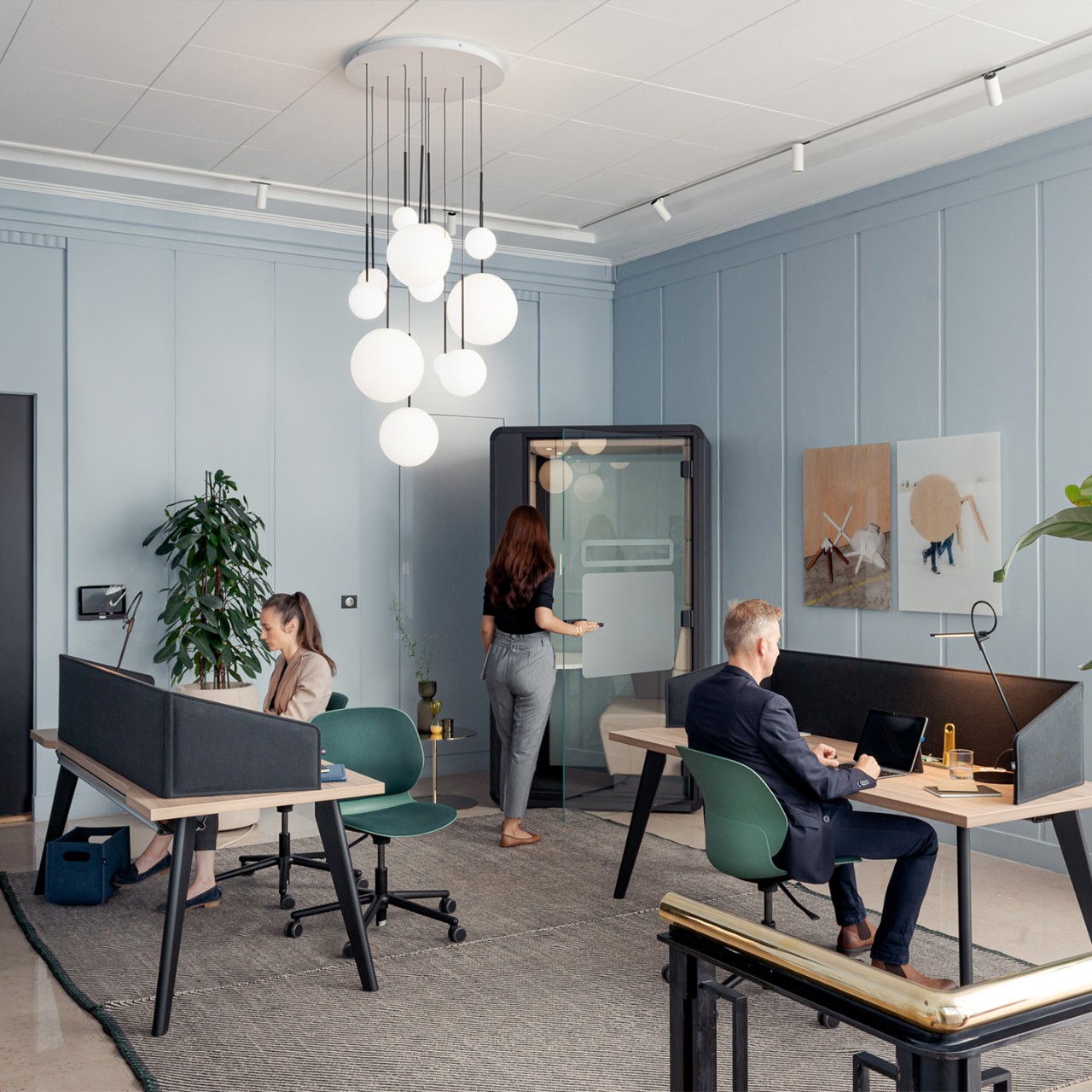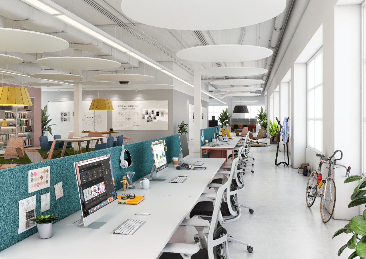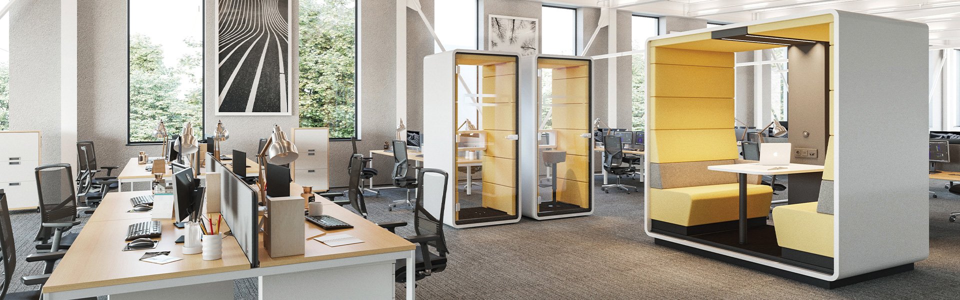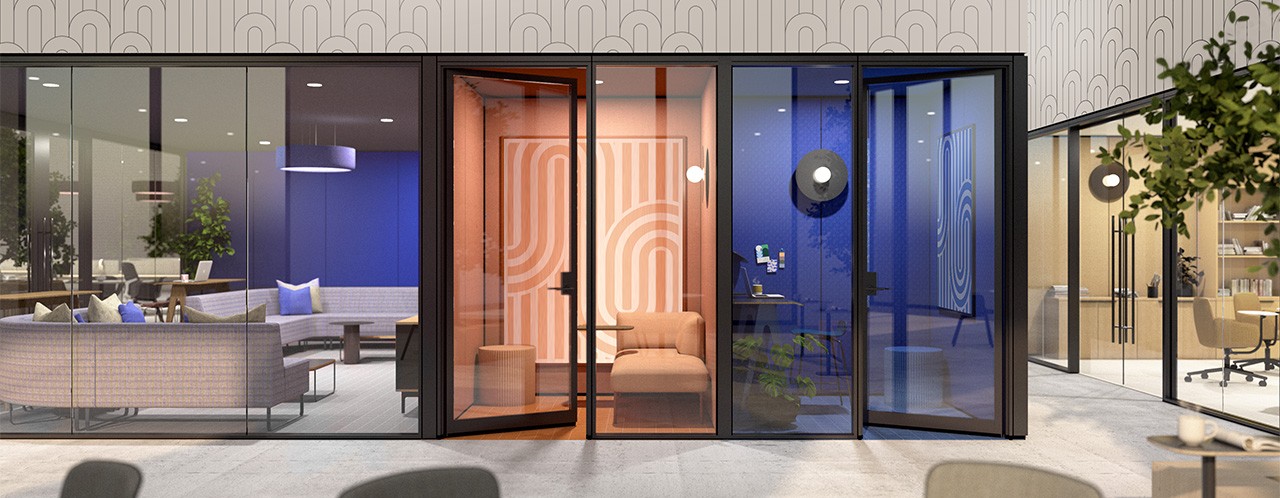 architectural space delineation solutions that allow for configuration (and re-configuration) of private spaces within the office. Moveable walls and freestanding workspaces allow for a range of options without the permanence of construction.