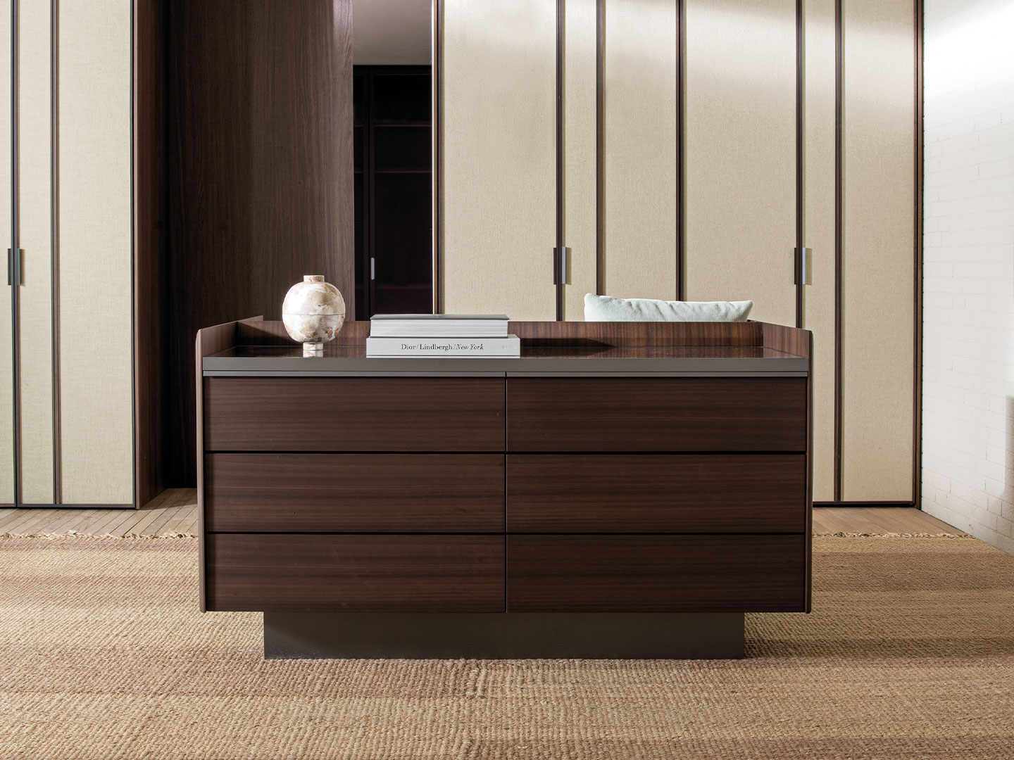 Gliss Master Island is a central island unit, a freestanding element that completes the wardrobe area of a walk-in closet or closet area. Storage trays and elegant shelves finished in Eco Skin are just some of the distinctive elements.