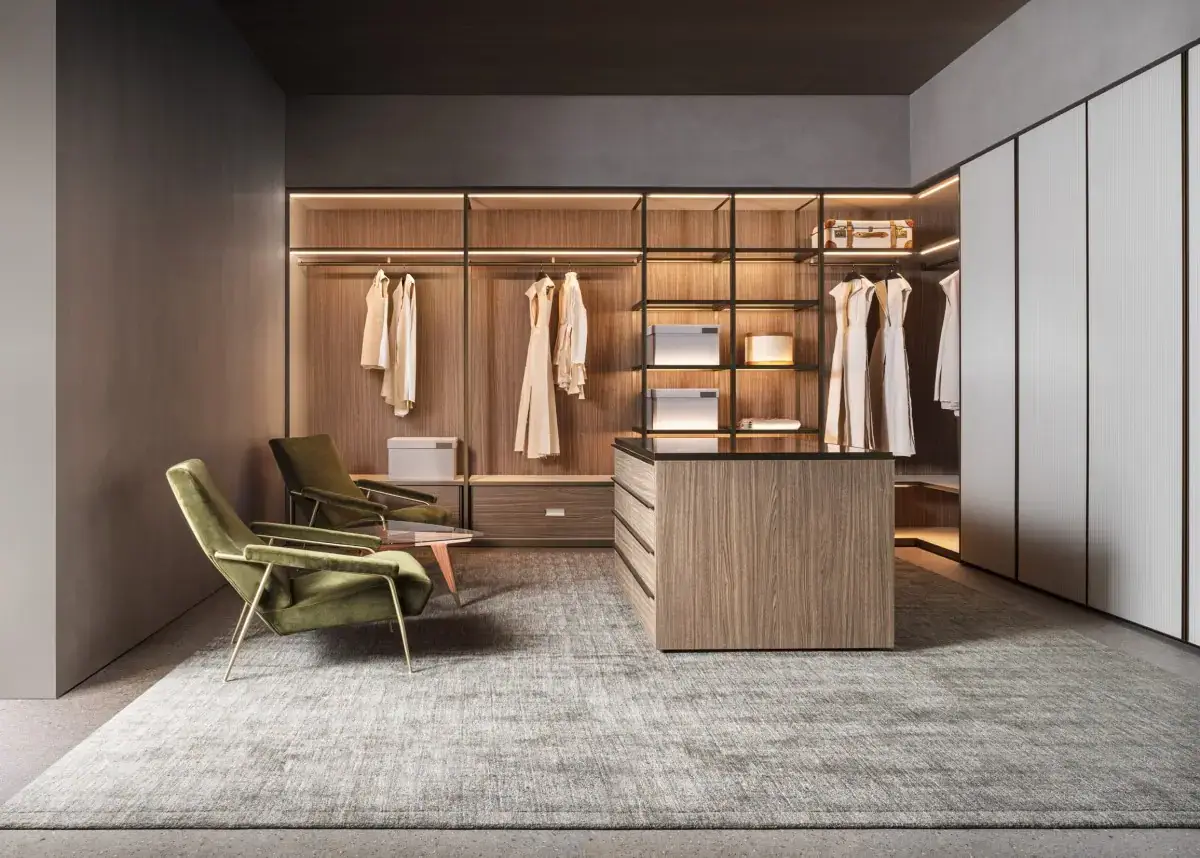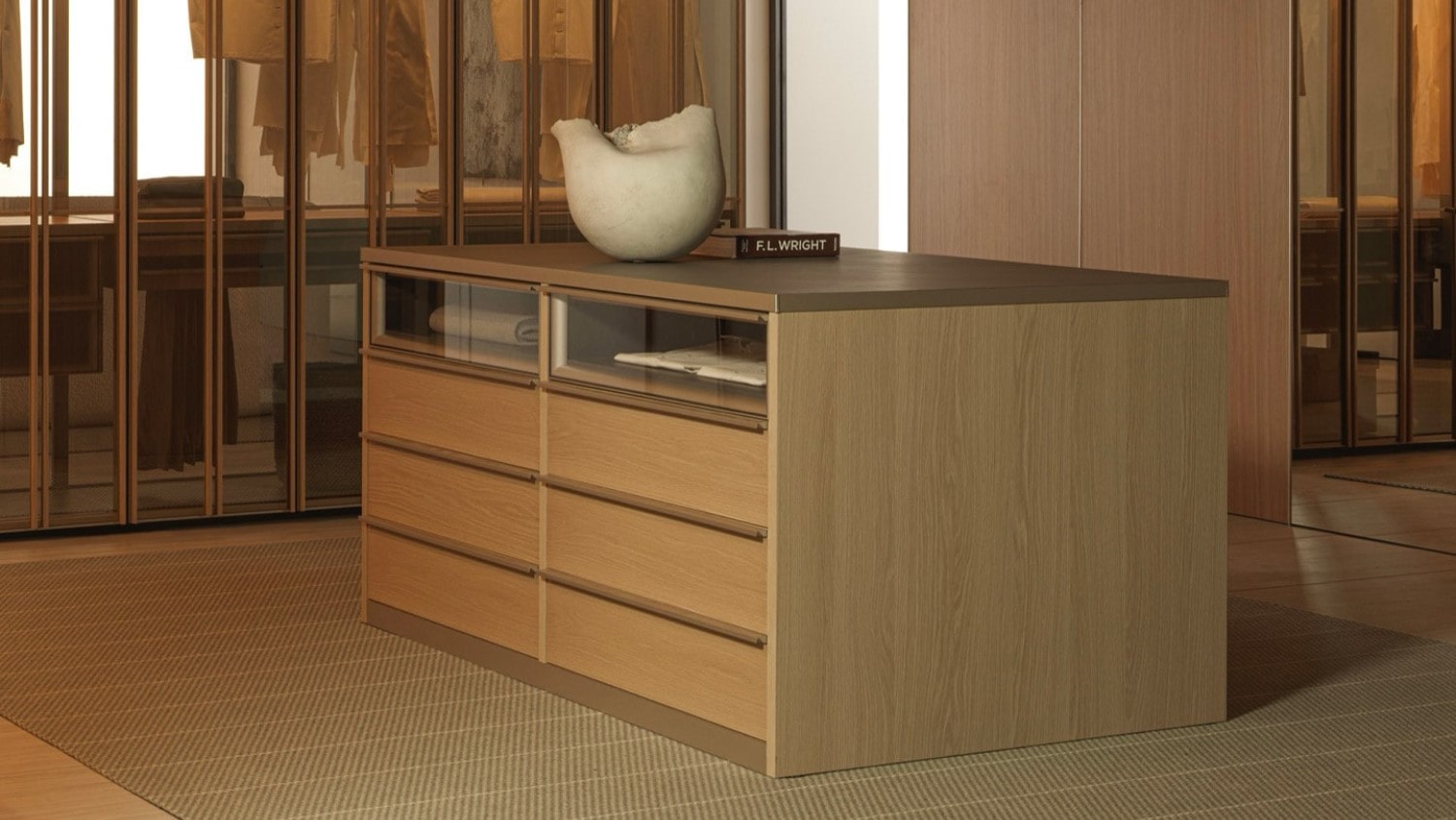 Gliss Master Island is a central island unit, a freestanding element that completes the wardrobe area of a walk-in closet or closet area. Storage trays and elegant shelves finished in Eco Skin are just some of the distinctive elements.