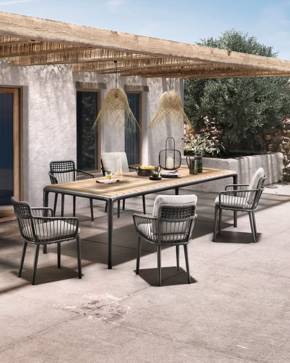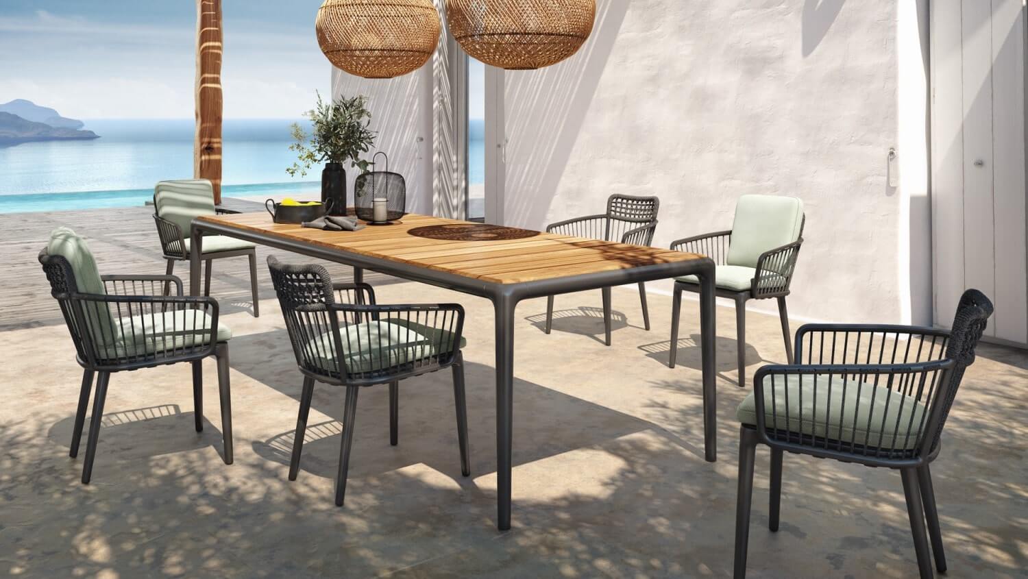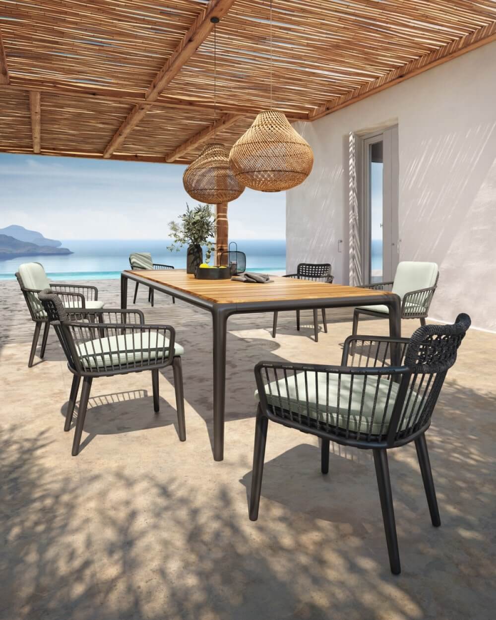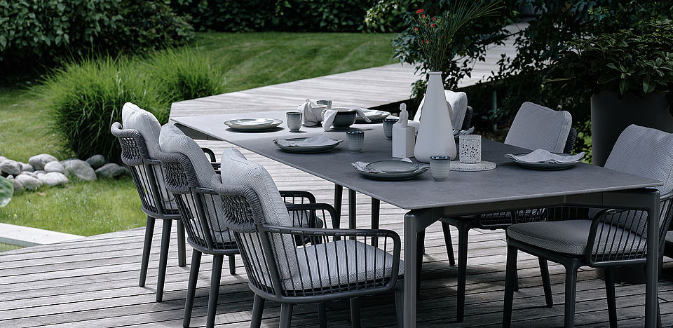 It’s not only easier to breathe freely in the open air, dining outside is also more pleasant. The elegant Rolf Benz Yoko table in three different dimensions provides space for company and is a sight for sore eyes outside, whichever combination of materials you choose. For the insertion leaf you can choose between teak and three different ceramic surfaces which contrast beautifully with the aluminium frame. The chairs in the collection with their unique, hand-crafted weave detail complete the arrangement for an evening with friends, or a home office with a gentle breeze. The Rolf Benz Yoko chair can optionally be upholstered with loose seat and backrest cushions since its rope weave detail alone provides ergonomic seating comfort.