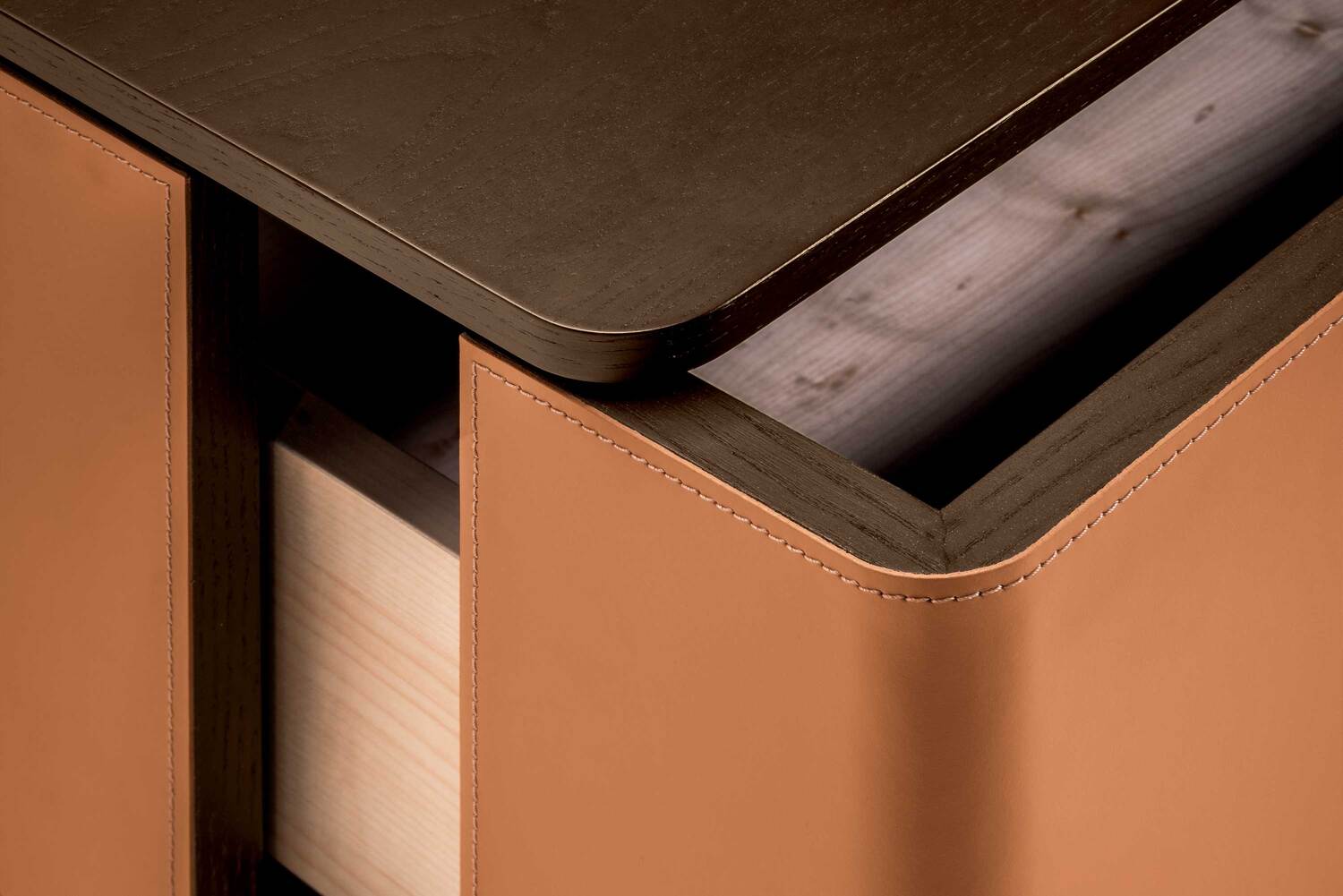Fidelio multimedia cabinet is a piece of furniture with an integrated screen, equipped to offer a perfect home cinema experience. The load-bearing structure is made of solid ash wood and ash veneered birch plywood. The internal structure is made of extra-clear maple. The top of the cabinet conceals the integrated projection screen, consisting of a vertical rise motor-driven canvas. Under the top with open-end compartments, two drawers are positioned to the right and to the left of the central compartment.